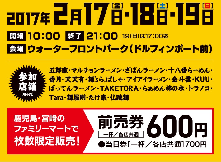 18の味を食べ尽くせ!赤字覚悟の勝負麺!鹿児島ラーメン王決定戦3 前売券発売中~2/17(金)・18(土)・19(日)開催~