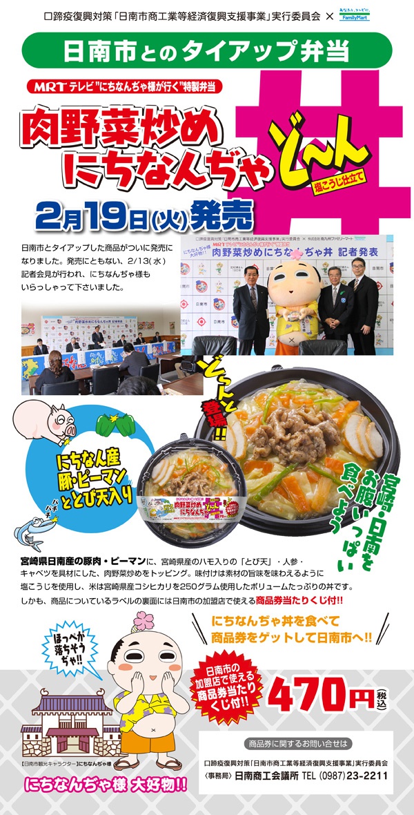 日南市とのタイアップ弁当~MRTテレビ“にちなんぢゃ様が行く”特製弁当『肉野菜炒め にちなんぢゃど~ん』