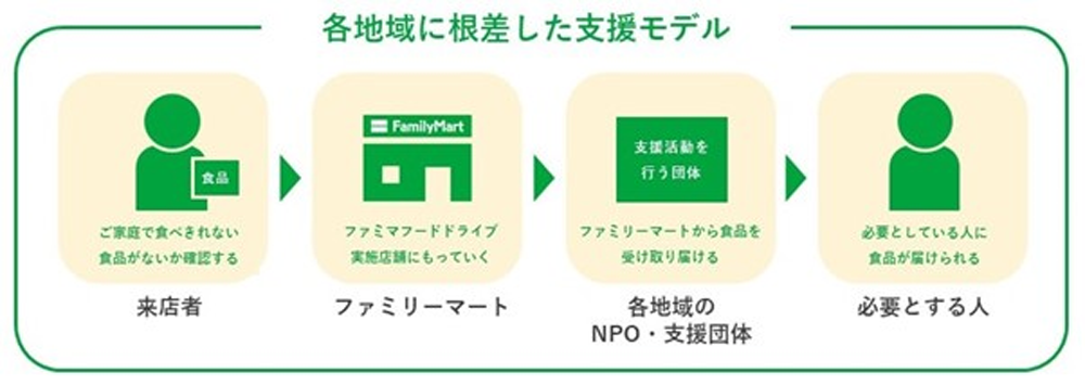 「ファミマフードドライブ」は、ご家庭にあるもったいない食品をファミリーマート店舗にお寄せいただき、地域のこども食堂やフードパントリーなどの活動を行うNPOや社会福祉協議会などの協力パートナーを通じて、食支援が必要な方々へお届けする取り組みです。ファミリーマートを回収拠点とすることで、地域の皆さまが、いつでも気軽に社会貢献活動に参加できることが特徴です。