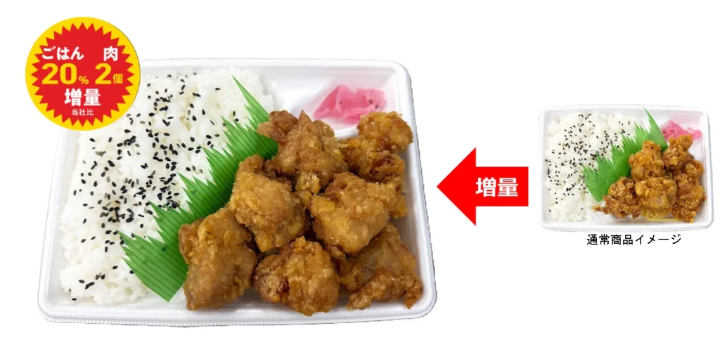 昨今の原材料費や物流費の高騰に伴い、生活必需品など多くの商品の値上げが相次いでおります。このような中、南九州ファミリーマートは地域密着を掲げる企業として「地域の皆さまの家計負担を軽減するとともに、満足感たっぷりの食事を楽しんでいただきたい」という想いを込め、1月27日(火)からの1週間、お弁当の「九州醤油仕立ての唐揚弁当」と「チキン南蛮弁当」の2種類において、価格はそのままに『ごはん20% & 肉+2個』を増量いたします。