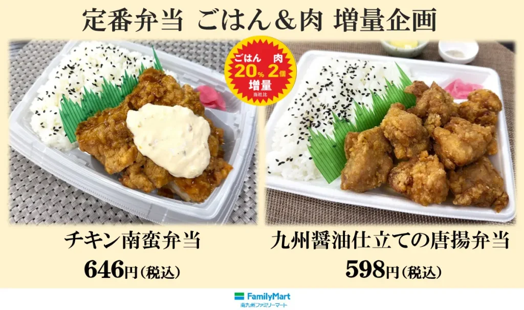 株式会社南九州ファミリーマート(本社:鹿児島県鹿児島市、代表取締役社長:飯塚隆)は、物価高騰に対する地域への生活応援策として、2026年1月27日(火)から2月2日(月)の1週間限定で、人気の定番弁当2種類のごはん&肉の増量企画を、鹿児島県・宮崎県のファミリーマート394店舗にて開催いたします。