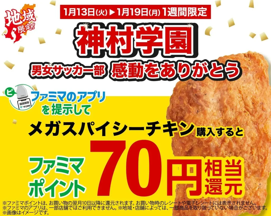 株式会社南九州ファミリーマート(本社:鹿児島県鹿児島市、代表取締役社長:飯塚隆)は、 全国高校サッカー大会における「学校法人 神村学園」男女サッカー部の偉業を祝し、2026年1月13日(火)から1週間限定で、鹿児島県内のファミリーマート260店舗にて、『神村学園 感動をありがとう!キャンペーン』を行います。