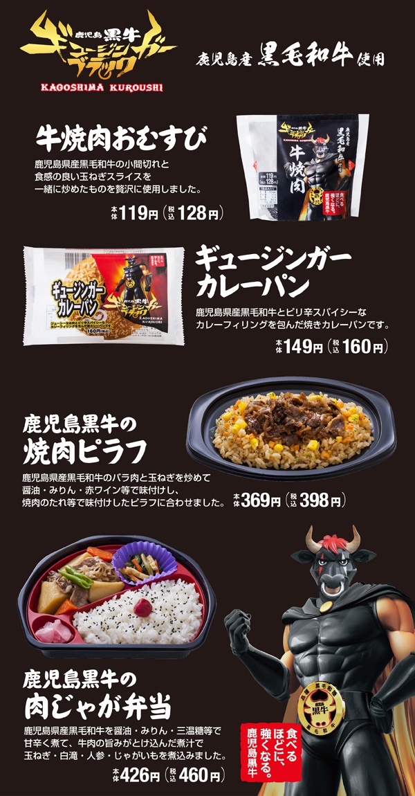 鹿児島黒牛ギュージンガーブラック「牛焼肉おむすび」「ギュージンガーカレーパン」「鹿児島黒牛の焼肉ピラフ」「鹿児島黒牛の肉じゃが弁当」