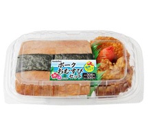 | 【内 容】 | 奄美群島で良く食べられるランチョンミートを乗せたおむすびセットです。ご飯とポークの間にマヨネーズを入れました。
