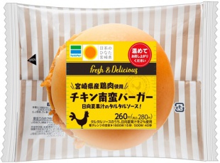 | 【内 容】 | 宮崎県産鶏ムネ肉を使用し、タルタルソースを合わせたバーガー。タルタルソースには宮崎県産日向夏果汁を入れ、風味よく仕立てております。 |