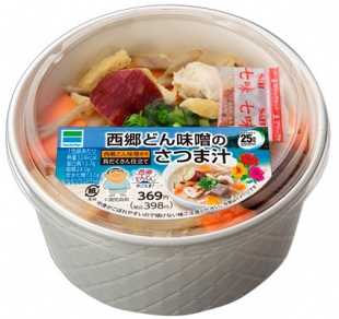 | 【内 容】 | 「西郷どん味噌」を使用したみそ汁に、鹿児島県産鶏のムネ肉、人参、大根、さつま芋、こんにゃくの具材を煮込み、小ねぎを盛り付けました。別添で七味唐辛子付き。 |