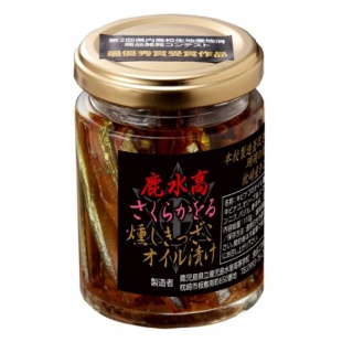 | 【内 容】 | 枕崎で水揚げされた「きびなご」を1匹づつ丁寧に頭と尾、内臓をとり、当校の自家製塩の塩水に漬け、乾かした後、桜の木のチップでスモークをかけています。 きびなごを瓶にそろえて並べ、にんにく・バジル・香辛料を入れ混合油を注ぎ、加熱殺菌しました。桜のスモークの風味感じる地元枕崎産にごだわった鹿児島水産高校渾身の一品です。 |