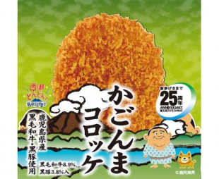 | 【内 容】 | 鹿児島県産黒毛和牛、黒豚をたっぷり使用したコロッケ。肉配合比率は12.7%と肉感を感じる仕立てとしました。鹿児島県のキャラクター「西郷どん」を取り込んだ専用包材で訴求を行います。