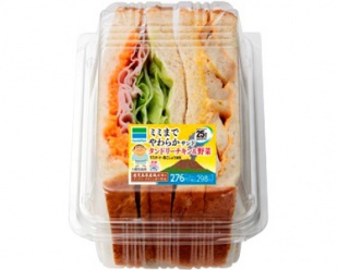 | 【内 容】 | 「ミミまでやわらかおいしい全粒粉食パン」を使用。鹿児島県産鶏ムネ肉を使用したタンドリーチキンと、レモンマヨが利いた野菜サンドの2層仕立てのサンドイッチ。 |