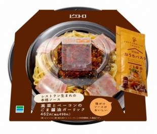 今回、同社とパスタ商品の共同開発を行い、同社の人気パスタソースである『おうちパスタ』(ボトル入り)の「ごま醤油ガーリック」「ペペロンチーノ」の小袋タイプを別添し、レンジで温めた商品に後がけすることにより、人気パスタチェーン店の本格的な味を、お手軽に楽しめる仕立てで発売をいたします。