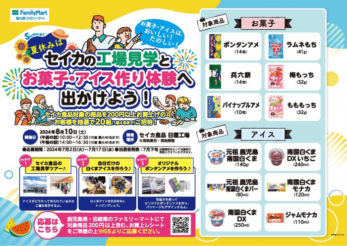 株式会社南九州ファミリーマート(本社:鹿児島市真砂本町/代表取締役社長 飯塚 隆)は、セイカ食品株式会社(本社:鹿児島市西別府町/代表取締役社長 玉川 浩一郎)の協力のもと、セイカ食品の対象商品を購入して応募するコラボ企画「セイカの工場見学とお菓子・アイス作り体験へ出かけよう!」を、鹿児島県・宮崎県のファミリーマート(2024年5月末現在:392店舗)にて開催いたします。