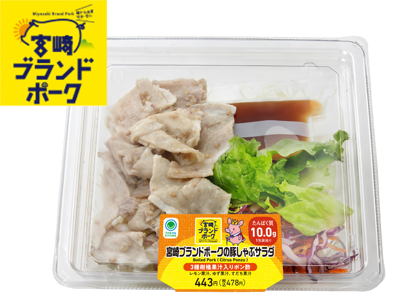 【内 容】 | やわらかくしっとりと仕立てた宮崎ブランドポークの豚しゃぶをトッピングしたサラダです。柑橘果汁入りのポン酢で、さっぱりとした酸味が楽しめます。 |