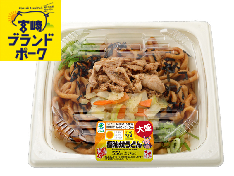 【内 容】 | 甘濃い醤油ベースのタレで和えた宮崎ブランドポークをたっぷりトッピング。醤油、だしの素、しょうがで味付けした、ボリュームたっぷりの焼うどんです。 |
