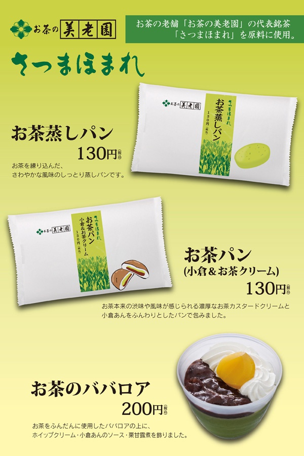 お茶の老舗「お茶の美老園」の代表銘茶「さつまほまれ」を原料に使用した「お茶蒸しパン・お茶パン・お茶のババロア」